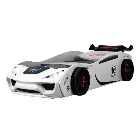 Pat pentru copii masina ECO VENTO, cu faruri, alb, 90x190 cm