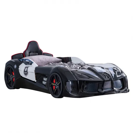 Pat pentru copii masina POLICE, cu sunet, telecomanda si lumini led, negru, 90x190 cm