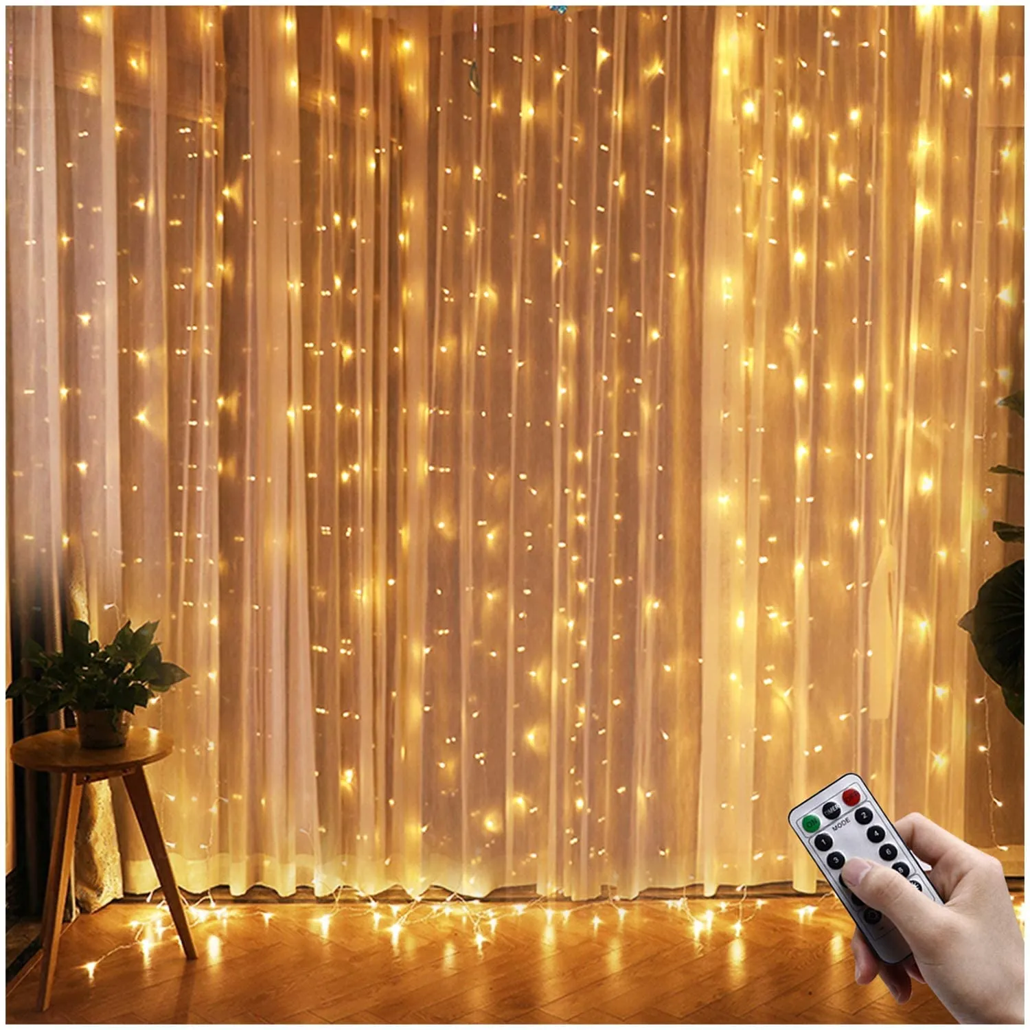 Perdea lumini, Vaxiuja, 300 LED-uri, 8 Programe, Alimentare USB, Impermeabila, 3x3m, Alb cald