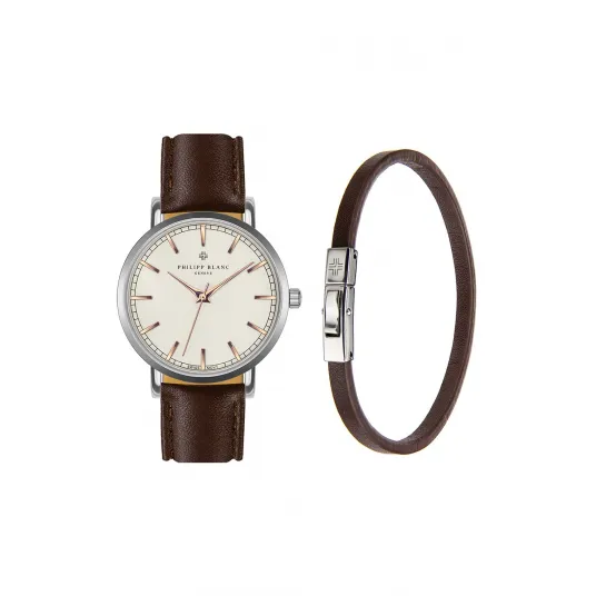 Philipp Blanc, Set unisex de ceas si bratara de piele, Maro inchis