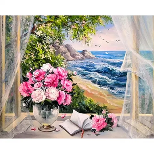 Pictura dupa numar Umplere flori roz de la malul marii 40*50cm Pictura panza potrivita pentru iubitorii de pictura, vopsele acrilice (Tablou Fara rama Print digital)