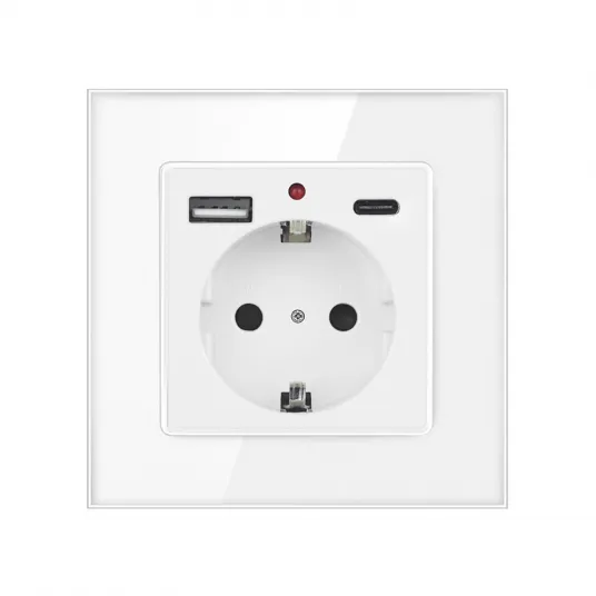 Priza simpla, SINBINTA, 5V 2.1A, 250V, 20W, Curent maxim de sarcina 16A, Cu indicator luminos, Rama din sticla, USB A+TypeC, Cel incastrat, Pentru aparatele electrocasnice conventionale, ABS, 86 x 86mm, Alb