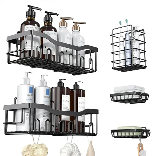 Raft de dus, etajera baie, din otel inoxidabil, pentru depozitare in bucatarie, organizator baie, set 5 bucati, cu adeziv, NegruRaft de dus, etajera baie, din otel inoxidabil, pentru depozitare in bucatarie, organizator baie, set 5 bucati, cu adeziv, Negru223201457223201457