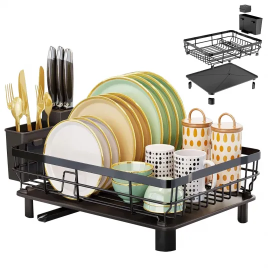 Raft scurgator de vase, Potrivit pentru bucatarii, Wacorresi, cu suport tacamuri, tava scurgere, metal, 43 x 33 x 15 cm, negru