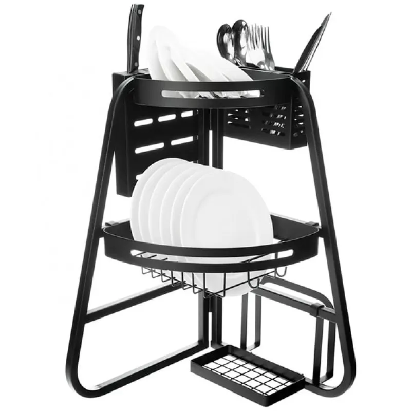 Raft scurgator de vase Quasar & Co., etajat, de colt, cu suport cutite si tacamuri, metal, 32 x 32 x 52,5 cm, negru