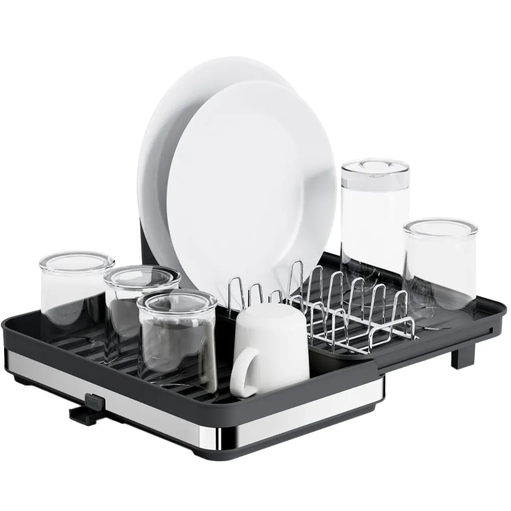 Raft scurgator de vase, Quasar & Co.®, extensibil, cu suport tacamuri, tava scurgere, 30-51 x 36.5 x 17.5 cm, metal/plastic, negru