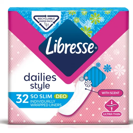 Absorbante zilnice Libresse So Slim Deo Fresh, 32 bucati Bucura-te de prospetime si protectie cu absorbantele Libresse!Caracteristici: •Designul unic CurveFit™ face ca absorbantul zilnic sa se aseze perfect pe lenjerie, oferindu-ti o senzatie de maxim confort pe durata intregii zile;•Protectie zilnica pentru o senzatie sporita de prospetime si uscat;•Formula ProSkin:◦cu infuzie de acid lactic pentru a mentine pH-ul pielii echilibrat, pentru o zona intima sanatoasa;◦lasa pielea sa respire, asemenea lenjeriei de bumbac.