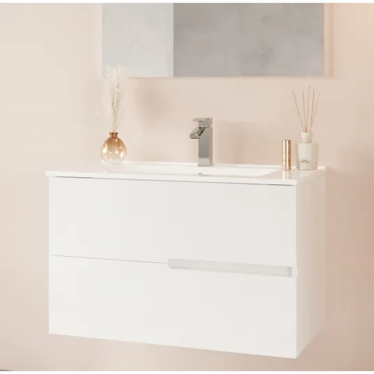 Baza mobilier suspendat Kring Eva cu 2 sertare, inchidere amortizata si lavoar ceramic, front MDF alb lucios infoliat, laterale PAL vopsit alb lucios, 81x46.5x53cm