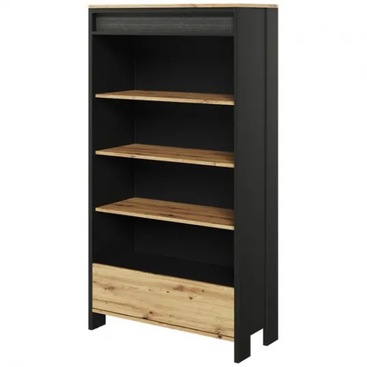 Biblioteca Woodmood Spot, 72x38x161 cm, 1 sertar 3 polite, iluminare, culoare negru/stejar este mobilierul perfect pentru orice interior pentru a-ti expune cartile preferate, decoratiunile sau obiecte de familie indragite Biblioteca a fost conceputa cu rafturi incapatoare si un sertar usor accesibil care culiseaza cu usurinta datorita sistemului cu bile. Combinatia de culori dintre negru si stejar creeeza o atmosfera speciala impreuna cu banda luminoasa.