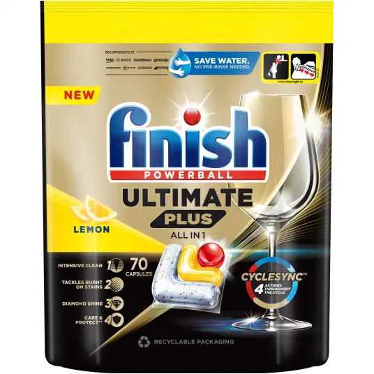 Detergent capsule pentru masina de spalat vase Finish Ultimate Plus, 70 spalariDetergent capsule pentru masina de spalat vase Finish Ultimate Plus, 70 spalari FARA PRE-CLATIRE ECONOMISESTE PANA LA 80L* DE APA PER CICLU DE SPALARE *Aproximativ 80L de apa sunt consumati prin spalarea de mana a vaselor prin comparatie cu un ciclu de spalare ECO la masina de spalat vase. 96L de apa este o valoare medie, conform unui studiu Nielsen realizat pentru Reckitt in Romania, Polonia, Cehia si Ungaria. IMBUNATATESTE-TI EXPERIENTA DE SPALARE SOLUTIA DE CLATIRE Pentru o uscare fara pete a vaselor si protectie impotriva matuirii paharelor. SOLUTIA PENTRU CURATAREA MASINII DE SPALAT VASE Elimina depunerile de grasime si calcar si contribuie la prelungirea vietii masinii de spalat vase.222214370222214370