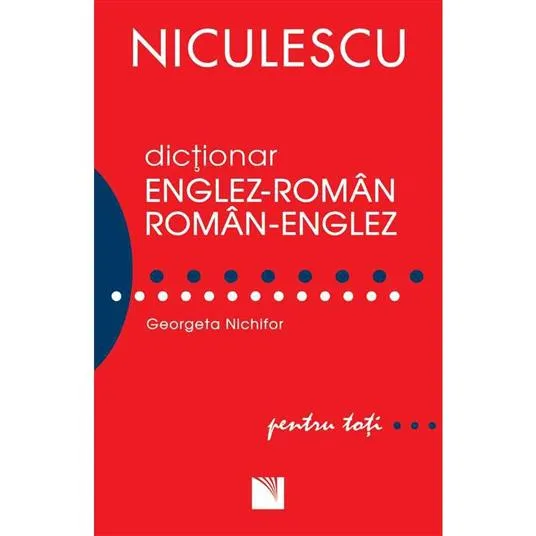 50 000 DE CUVINTE SI EXPRESII ... PENTRU TOTI! Instrument de lucru simplu, eficient si practic, structurat in sectiunile pandante "englez-roman" si "roman-englez" si adunand in paginile sale aproximativ 50 000 de cuvinte si expresii, atent selectate in conformitate cu normativele actuale ale acestei limbi, dictionarul oferit de Georgeta Nichifor - redactor de limba engleza, cu o experienta de peste 30 de ani in domeniu si ingrijitoare a peste 40 de lucrari cu profil lingvistic (dictionare si manuale de limba engleza), coautoare a lucrarii "Engleza distractiva" - este incadrat in populara colectia a Editurii NICULESCU, "Dictionare pentru toti", fiind dedicat unui public larg, caruia ii propune o arie semantica acoperitoare celor mai generale utilitati. Traseul lexical urmarit de volum - la a carui elaborare au fost consultate prestigioase "surse lexicografice" britanice, americane ("Oxford", "Webster", "Collins", "Longman") si romane ("Dictionarul explicativ al limbii romane") si pe parcursul caruia consultantului ii vin in ajutor exemplificari menite a inlatura confuziile in cazul "polisemantismelor", atentia acordata chiar termenilor si sensurilor noi, "la moda", din zona colocvialului, si, ca ELEMENT DE NOUTATE, semnalarea DESPARTIRII IN SILABE A CUVANTULUI-TITLU - isi indeplineste functia promordiala, de sursa de acumulari lingvistice de baza, fundament pentru aprofundarile ulterioare.