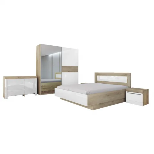 Dormitor Irim Glossy, Pat 160x200, Dulap usi glisante, 2 Noptiere, Comoda