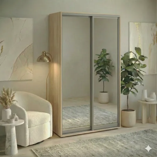 - Шкаф с двумя зеркальными дверцами идеально подходит для утренних сборов или для визуального увеличения небольшой комнаты.