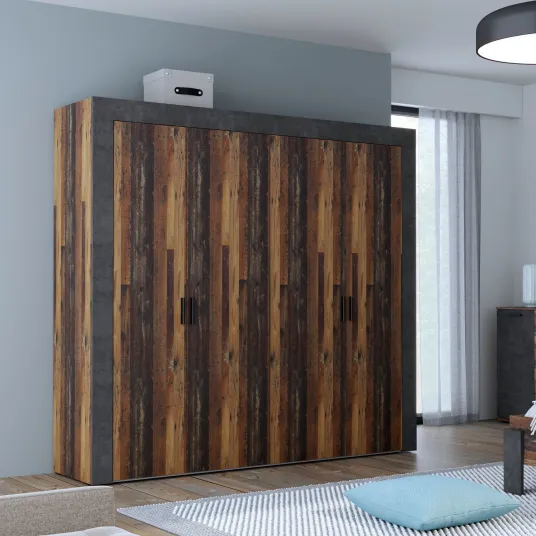 Dulapul cu 4 usi din colectia Attalyar este perfect mai ales intr-un dormitor amenajat in stil industrial. Dispune de spatiu bine organizat, cu doua bare de umerase, 3 rafturi reglabile si 2 rafturi fixe largi. Cu aceasta structura, garderoba va permite sa stocati diverse articole, nu numai imbracaminte, ci si echipamente sportive, articole hobby, documente sau fotografii. Dulapul spatios are dimensiunile: latime 230,1 cm x inaltime 210,5 cm x adancime 54,2 cm, asigurand un spatiu de depozitare optim. Combinatie eleganta de decor din lemn vintage si beton gri inchis. Sarcina maxima a barei de umerase: 15 kg. Sarcina maxima a rafturilor: 5 kg. Stabilitatea acestei piese de mobilier este asigurata prin montarea pe perete (feronerie inclusa).