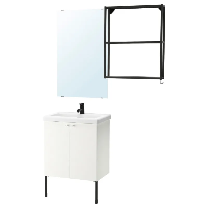 ENHET/TVALLEN Мебель для ванной комнаты, набор из 11 предметов, белый/антрацитовый смеситель Saljen, 64x43x87 см