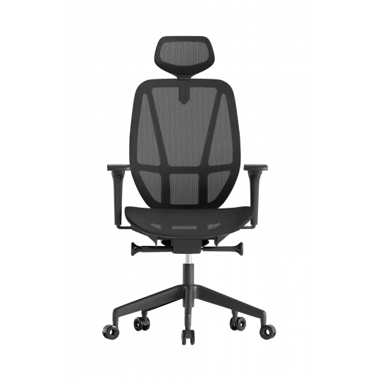 офисное кресло, поворотное, сиденье из эластомерной переработанной сетки, спинка из эластомерной переработанной сетки, переработанной, фиксированная поясничная поддержка, нерегулируемый подголовник, регулируемые подлокотники, полиуретановые колеса, черный