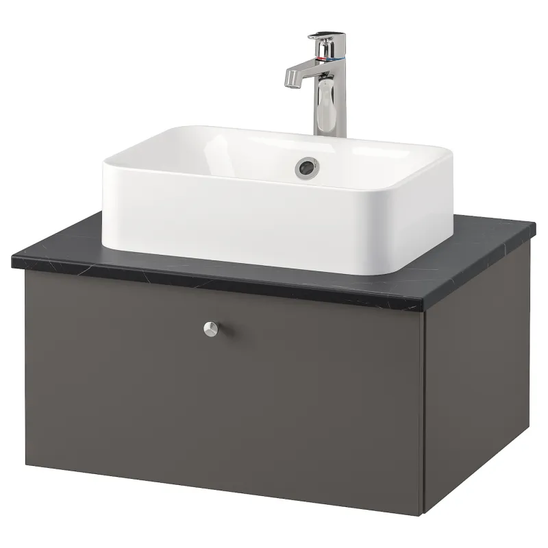 - Наименование товара: ГОДМОРГОН/ТОЛКЕН / ХОРВИК Маска для умывальника+раковина сверху, Gillburen темно-серый/черный мраморный смеситель Brogrund, 62x49x43 см