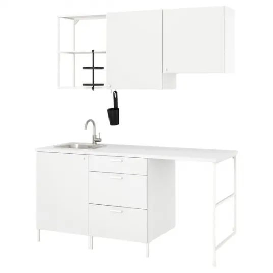 Cod corp ENHET K126, Cu usi si fronturi sertar albe poti crea un aspect simplu, neutru si proaspat pe care il poti asorta cu accente in culori variate. Un stil usor de placut, mereu la moda., Cu o combinatie de depozitare deshisa si inchisa, un spatiu de lucru functional si spatii planificate pentru o masina de spalat si plita portabila, ai o solutie de bucatarie multifunctionala., Bucataria se poate folosi si ca zona de spalatorie cand ai un loc dedicat pentru o masina de spalat. Nisa se poate folosi si ca spatiu de depozitare suplimentar., Corpul baza lat cu sertare iti ofera mult spatiu pentru a organiza si a depozita ustensile de bucatarie si articole mai mari precum tocatoare, boluri, oale si cratite., Lucrurile care tind sa para dezordonate pot fi puse in corpurile suspendate, iar cadrul suspendat ofera acces facil la lucrurile esentiale folosite frecvent. Este prevazuta cu o polita rotativa care ofera o privire de ansamblu a lucrurilor mai mici., Poti adauga cu usurinta mai multe accesorii ENHET pentru a extinde utilizarea combinatiei de depozitare. Cel mai bine este ca nu trebuie sa dai gauri. Se vand separat., Sistemul unic cu dibluri cu pana face asamblarea usoara si dispozitivele de fixare sunt aproape invizibile., Sunt necesare unelte si pregatire pentru a taia blatul la dimensiunea dorita si a decupa orificiile pentru chiuveta si baterie ca sa se potriveasca perfect., Trebuie fixat de perete pentru o instalare in siguranta. Peretii din materiale diferite necesita diferite tipuri de dispozitive de instalare. Foloseste dispozitivele adecvate pentru peretii din casa ta; se vand separat., Aparatele si produsele de iluminat se vand separat., Include: corp, panou lateral/picior de sustinere, picior, maner, blat, chiuveta, sifon, baterie, polita rotativa, carlig si recipient.