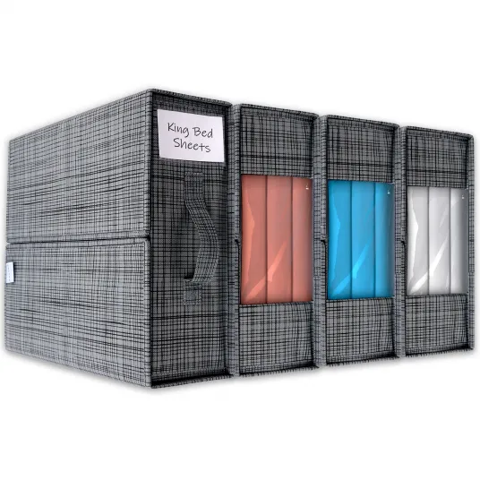 Pachet de 4 Organizatoare de Cearsafuri si Depozitare - Solutie Pliabila pentru Dulapul de Lenjerie, Pilotelor si Fetelor de Perna, Design cu Fereastra Transparenta