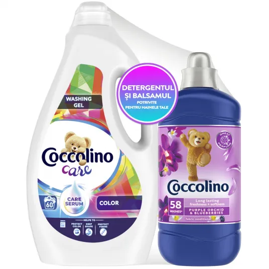 Pachet Detergent lichid Coccolino Care Color, 60 spalari, 2.4L + Balsam de rufe Coccolino Purple Orchid Blueberries, 58 spalari, 1.45L