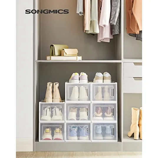 Pantofar din plastic, Songmics, Alb, 35x25x18.5 cmDa-i drumul la mizerie: Daca locuinta ta devine incet dar sigur o dezordine de pantofi, de ce sa nu-i organizezi in acest pachet de 8 cutii de pantofi clasice cu corp transparent si usa frontala? Vedeti-va intreaga colectie in ordine<br><br>Pastrati-l clar: Nu trebuie sa va scoateti si sa cautati in fiecare dimineata in cutiile de pantofi pentru a va gasi pantofii de naveta, corpul clar cu usa frontala transparenta va ofera o privire in interiorul turnului dvs. de pantofi cu o usurinta de apucare si fuga.<br><br>Configurare rapida: Pur si simplu, puneti impreuna partea din fata, spatele si corpul si veti avea aceste organizatoare de pantofi cu o dimensiune interioara de 31 x 24,5 x 17,5 cm pentru max. marimea 10,5 din Marea Britanie; fiecare pereche de adidasi, tocuri sau pantofi cu toc va avea un loc al ei.<br><br>Stack 'Em Up: Daca doriti sa depozitati cutiile intr-un mod organizat, designul cu fante corespunzatoare din partea de sus si de jos face ca stivuirea lor sa fie un joc de copii; gaurile de ventilatie permit pantofilor sa respire.<br><br>Ce primesti: Pachet de 8 cutii de pantofi transparente cu usa frontala transparenta, design stivuibil si pliabil, gauri de ventilatie. Spuneti adio pantofilor imprastiati peste tot si puneti-va acum pantofii in ordine!224186959224186959