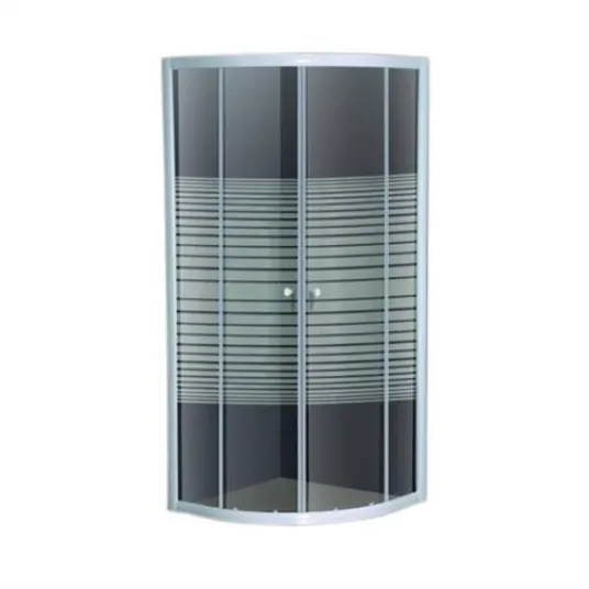 Полукруглый экран размером 90х90х185см. Стекло закреплено, модель с горизонтальными полосами по центру (сетка) и имеет толщину 5 мм. Профиль изготовлен из алюминия, белого цвета и очень большой, что придает стеклу очень хорошую устойчивость. Кабина состоит из 2 неподвижных стен и 2 раздвижных дверей. Его можно монтировать как на ванну, так и на пол.