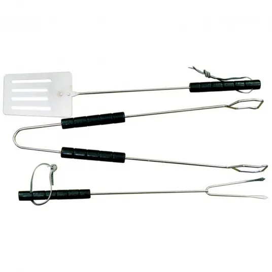 Set practic de accesorii pentru gratar, care include clesti, furculita si spatula. Ustensilele sunt din otel, manerele sunt din plastic.