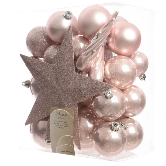 Set de 32 globuri cu varf de brad Kaemingk, dimensiuni asortate, Roz pal