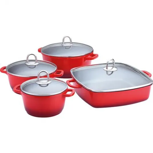 Кулинарный набор содержит 4 алюминиевых горшка с неплотной керамической поверхностью.