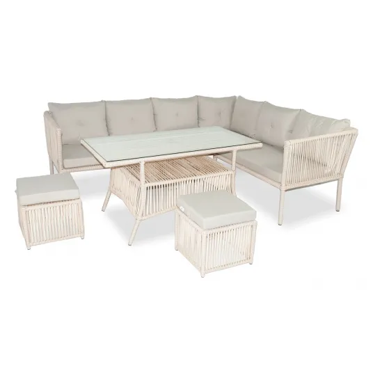 Bucurati-va de relaxare maxima in timp ce va scufundati in pernele de plus ale canapelei noastre de colt. Cu dimensiunile sale generoase si designul sau ergonomic, aceasta canapea ofera un confort de neegalat. Fie ca va bucurati de o bautura racoritoare sau pur si simplu va bucurati de soare, setul nostru de lounge de gradina va asigura ca va veti simti ca pe un nor.