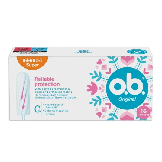Tampoane OB Original Super, 16 buc Cu tehnologia StayDry.Protectie fiabila cu canale curbate:1. Canalele curbate ghideaza eficient lichidul catre interiorul tamponului.2. Tehnologia StayDry conceputa pentru a te mentine uscata.Super -> Pentru flux mediu spre abundent. Intructiuni de utilizare:Spalati-va mainile, rasuciti ambalajul tamponului deschis dupa instructiunile sagetilor, apoi trageti in jos partea inferioara a invelisului.Apasati cu varful degetului aratator la baza tamponului si apoi eliminati restul ambalajului.Cu mana libera, tineti usor labiile departate. Deschiderea vaginala este localizata intre uretra si anus.Relaxati-va! Glisati usor tamponul cat mai mult posibil in sus si inapoi in vagin. Daca simtiti rezistenta, puteti incerca sa variati usor directia.Daca mai puteti simti tamponul, introduceti-l putin mai departe. Odata ce tamponul a ajuns unde trebuie, in partea de mijloc a vaginului dvs., nu il veti simti.Spalati-va din nou pe maini.