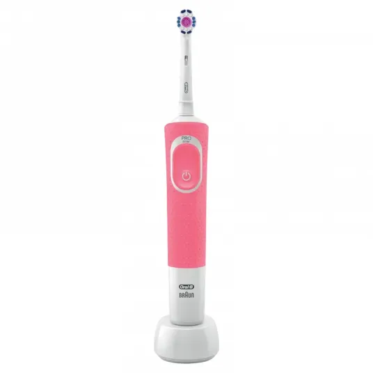 .toothbrush, rechargeable battery, rotating cleaning mode, timer 2 min, app control, charging station. white pink