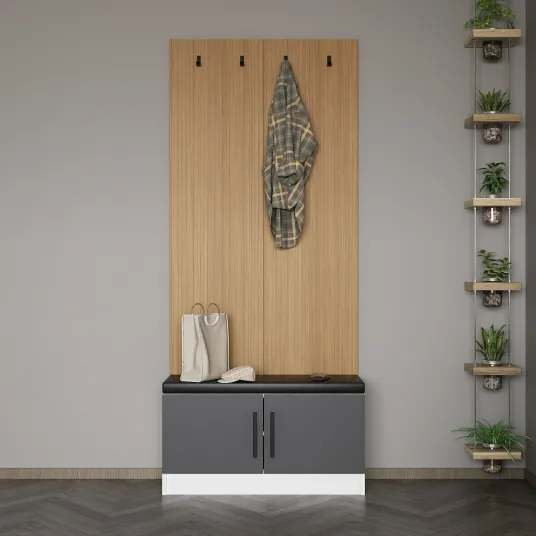 Cu dimensiunile sale generoase de 90 cm latime, 210 cm inaltime si 35 cm adancime, suportul nostru pentru hol ofera un spatiu amplu pentru a va pastra lucrurile bine organizate. Agatati-va paltoanele, esarfele si palariile pe carligele convenabile, in timp ce rafturile spatioase ofera un loc perfect pentru pantofii, gentile si alte accesorii.