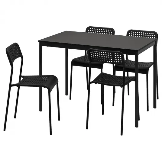 IKEA SANDSBERG / ADDE Masa + 4 scaune negru/negru 110x67 cm este un set de mobilier bine conceput, de inalta calitate, accesibil si functional. Este perfect pentru apartamente mici, gazduind petreceri de cina sau chiar ca spatiu de lucru pentru copii. Dimensiunea compacta, scaunele asortate si designul elegant il fac o potrivire excelenta pentru orice casa. Ca investitie pe termen lung, acest set de mese nu dezamageste.