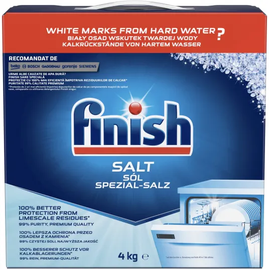 • Economie de detergent: Sarea pentru masina de spalat vase Finish ajuta la reducerea consumului de detergent, deoarece neutralizeaza impuritatile prezente in apa de alimentare.Astfel, vei putea economisi bani si vei obtine rezultate excelente de curatare.