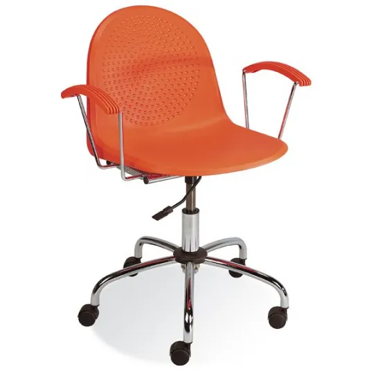 Un scaun de birou practic si extrem de durabil din gama Amigo.Sezutul si spatarul formeaza o „scoica” din plastic rezistent (polipropilena). Disponibil in numeroase culori interesante. Poti vedea mostre in sectiunea „Materiale” din partea stanga a paginii.Suprafata sezutului are proprietati anti-alunecare si este, de asemenea, igienica si usor de curatat. Consulta sectiunea „Galerie” pentru a vedea mai multe imagini cu scaunul.Scaunul este prevazut cu cotiere fixe cu un strat superior din plastic in aceeasi culoare ca restul scaunului.Cadrul metalic al cotierelor si baza de rulare sunt lustruite pana la culoarea crom.Inaltimea sezutului este reglabila in mod lin cu ajutorul unui piston pneumatic.Baza de rulare cromata este usoara si eleganta.Scaunul este dotat in standard cu role dure potrivite pentru suprafetele acoperite cu mocheta sau covor. Optional, poti comanda role moi care nu zgarie suprafetele dure precum parchetul sau gresia,la adaugarea produsului in cos.In oferta noastra este disponibil, de asemenea, si un model similar, pe patru picioare (Scaunul Amigo), dar si un model pe patru picioare cu cotiere (Scaun Amigo Arm). Consulta sectiunile „Din aceeasi gama” si „Produse similare”.Scaunul este acoperit de o garantie a producatorului de 3 ani in sistem Door-to-Door pentru confortul tau deplin.Iti livram scaunul GRATUIT oriunde in tara.IMPORTANT: Daca scaunul nu corespunde asteptarilor tale, in conformitate cu legislatia in vigoare, ai dreptul sa il returnezi in termen de 14 zile de la cumparare.Dimensiuni:
