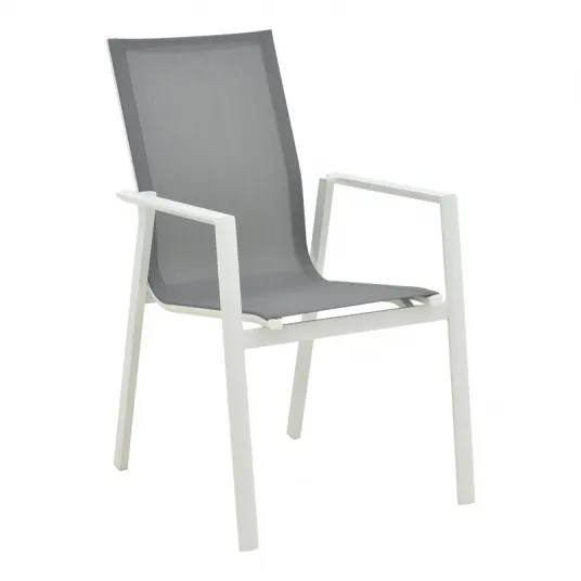 Scaunul este realizat dintr-o structura din aluminiu de inalta calitate, ce ii confera durabilitate si rezistenta la intemperii. Culoarea alba a metalului se imbina perfect cu textilena gri deschis, creand un contrast placut si modern. Dimensiunile sale de 71 cm lungime, 58 cm latime si 94 cm inaltime il fac ideal pentru orice tip de spatiu, fie ca este vorba de o terasa mica sau de o gradina spatioasa.