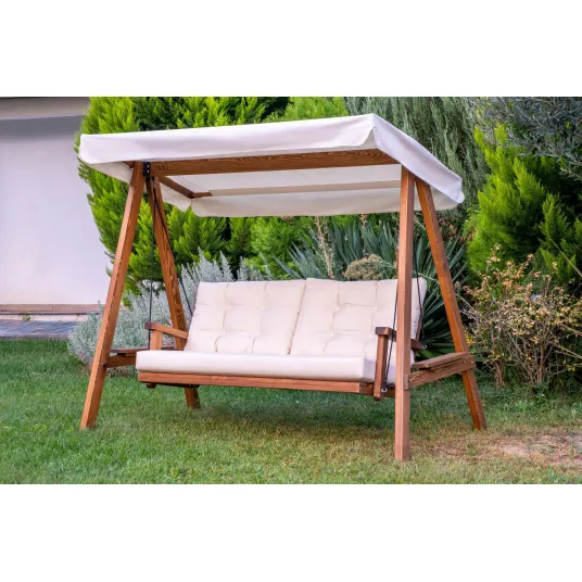 Scaunul nostru balansoar este fabricat cu un cadru din molid 100%, asigurand robustete si longevitate. tesatura este confectionata din 100% poliester, cantarind 210 grame, ceea ce o face atat usor de curatat, cat si rezistenta la uzura. Proprietatile impermeabile si rezistente la lumina ultravioleta ale tesaturii asigura faptul ca scaunul dvs. de leagan ramane in stare impecabila, chiar si in cele mai aspre conditii meteorologice. tesatura care nu se decoloreaza isi va pastra culoarea vibranta, adaugand o nota de eleganta spatiului dvs. de exterior.