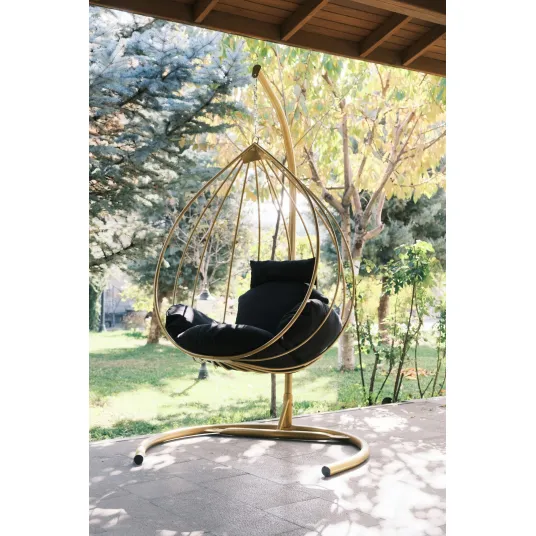 Realizat cu o atentie meticuloasa la detalii, scaunul nostru balansoar se mandreste cu o combinatie uimitoare de culori aurii si negre, adaugand o nota de rafinament oricarui decor in aer liber. Constructia 100% metalica asigura durabilitate si longevitate, permitandu-va sa va bucurati de aceasta piesa pentru multi ani de acum incolo.