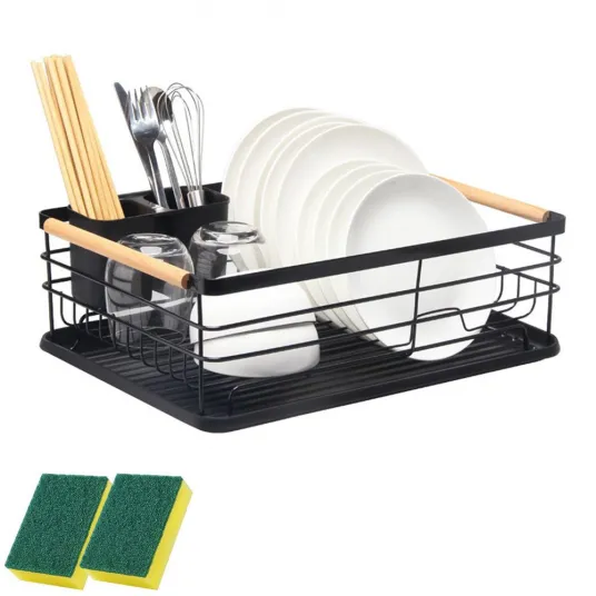 Scurgator vase chiuveta, vintage, Hokretme, Cu 2 bureti de spalat vase, suport tacamuri si manere lemn, negru, 43x32x14cm