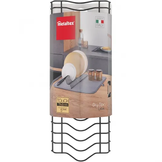 Scurgator vase Metaltex Dry-Tex Lava, 37x15x7cm, cu laveta absorbanta din microfibra 45X40cm, culoare gri, metal tratat Touch-Therm, culoare negru mat, aspect fier forjat