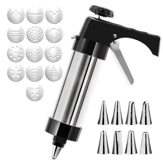 Seringa profesionala de patiserie, 13 discuri de biscuiti/8 duze, pentru umplut sau decorare, 15x22x5.6 cm, Inox/ABS, Amtok, Negru/ArgintiuSeringa profesionala de patiserie, 13 discuri de biscuiti/8 duze, pentru umplut sau decorare, 15x22x5.6 cm, Inox/ABS, Amtok, Negru/Argintiu223172547223172547