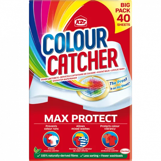 Servetele captatoare de culoare K2r Colour Catcher, 40 Spalari In timpul spalarii hainelor cu materiale si culori diferite, exista multe riscuri: decolorare, aparitia particulelor gri, a murdariei si a reziduurilor provenite din pete, facand hainele sa para mai terne. Color Catcher Complete Action este protectia potrivita pentru urmatoarele riscuri: accidente de culoare, aparitia albului cenusiu si pierderea stralucirii. Este activ la toate temperaturile, permite mixarea culorilor in timpul spalarii si previne redepunerea de murdarie. - Solutia potrivita impotriva accidentelor de culoare;- Fibre ultra captatoare;- Previne accidentele de culoare, protejand impotriva decolorarii si a accidentelor de culoare;- Economiseste timp si bani, permitand spalarea hainelor de culori diferite;- Pastreaza stralucirea culorilor pentru mai mult timp;- Previne aparitia albului cenusiu, asigurand curatarea materialelor;- Certificat FSC, servetelul si ambalajul de carton sunt biodegradabile si reciclabile.