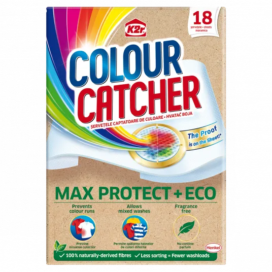 Servetele captatoare de culoare K2r Colour Catcher ECO, 18 SpalariServetele captatoare de culoare K2r Colour Catcher ECO, 18 Spalari In timpul spalarii hainelor cu materiale si culori diferite, exista multe riscuri: decolorare, aparitia particulelor gri, a murdariei si a reziduurilor provenite din pete, facand hainele sa para mai terne. Color Catcher Max Protect este protectia potrivita pentru urmatoarele riscuri: accidente de culoare, aparitia albului cenusiu si pierderea stralucirii. Este activ la toate temperaturile, permite mixarea culorilor in timpul spalarii si previne redepunerea de murdarie. - Solutia potrivita impotriva accidentelor de culoare;- Fibre ultra captatoare;- Previne accidentele de culoare, protejand impotriva decolorarii si a accidentelor de culoare;- Economiseste timp si bani, permitand spalarea hainelor de culori diferite;- Pastreaza stralucirea culorilor pentru mai mult timp;- Previne aparitia albului cenusiu, asigurand curatarea materialelor;- Certificat FSC, servetelul si ambalajul de carton sunt biodegradabile si reciclabile.222214825222214825