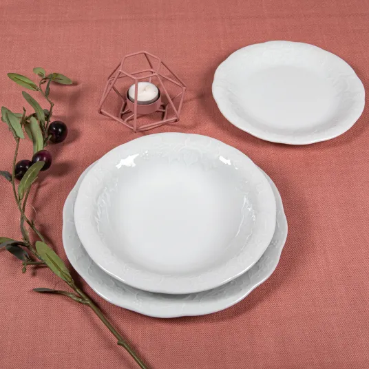 - Set de 24 de piese: Include 6 farfurii de masa, 6 farfurii de salata, 6 boluri de supa si 6 cani cu farfurii.