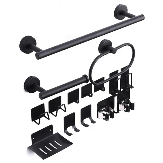 Set 15 piese accesorii baie inox, WALALLA, Suport pentru prosoape pahare sapun clip mop, Negru