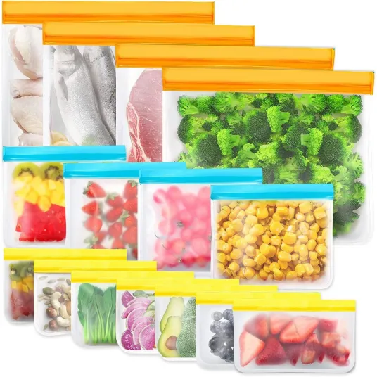 Set 15 Pungi alimentare Peva reutilizabile pe termen lung, CafuneplusВ®, Ideale Pentru Pastrarea Alimentelor Proaspete, Compatibile Frigider si Congelator, Perfecte Transport Pachet Pranz la Scoala Job, Multicolor