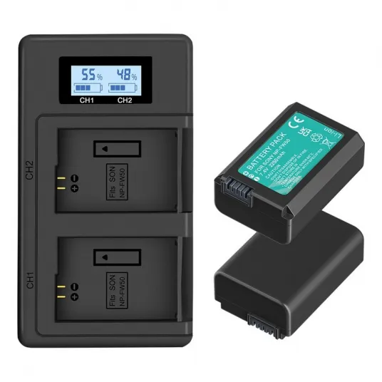 Set 2 baterii PALO NP-FW50 si incarcator LCD dual pentru Sony Alpha, NEX, Cyber-shot, negru