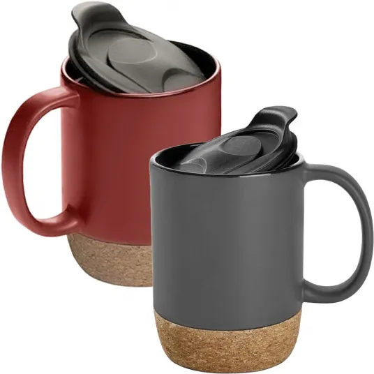 Set 2 cani cafea/ceai, Quasar & Co.®, pretabile voiaj/calatorie, cu capac to go, baza de pluta, ceramica, 400 ml, corai/gri