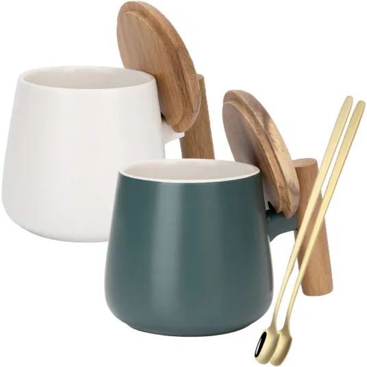 Set 2 cani cafea/ceai si lingurita, Quasar & Co.®, cu capac si maner bambus, lingurita inox, ceramica, 350 ml, alb/verde inchis